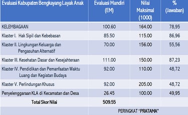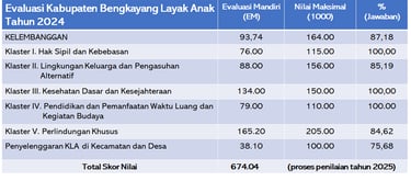 Pada tahun 2024 Hasil penilaian Mandiri Kabupaten Bengkayang Layak Anak mengalami peningkatan,namun belum mampu mengubah kategori peringkat Pratama .